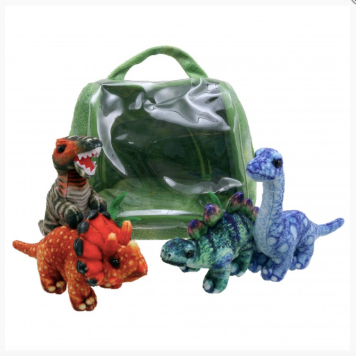 This versatile dinosaur set provides hours of interactive play value. Contains 4 assorted dinosaur finger puppets which can hide away in their playhouse. Includes T-Rex, Brontosaurus, Stegosaurus, Triceratops.