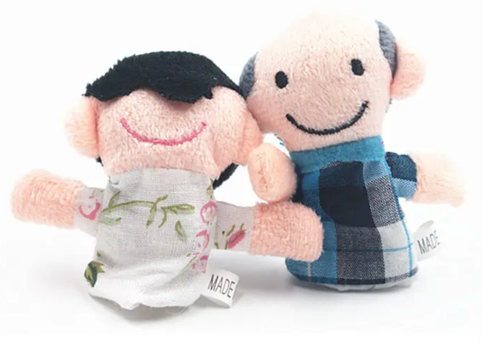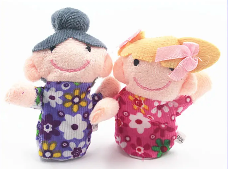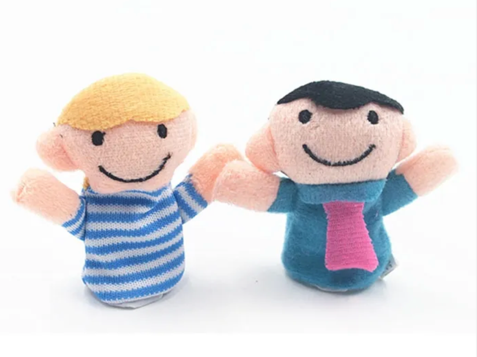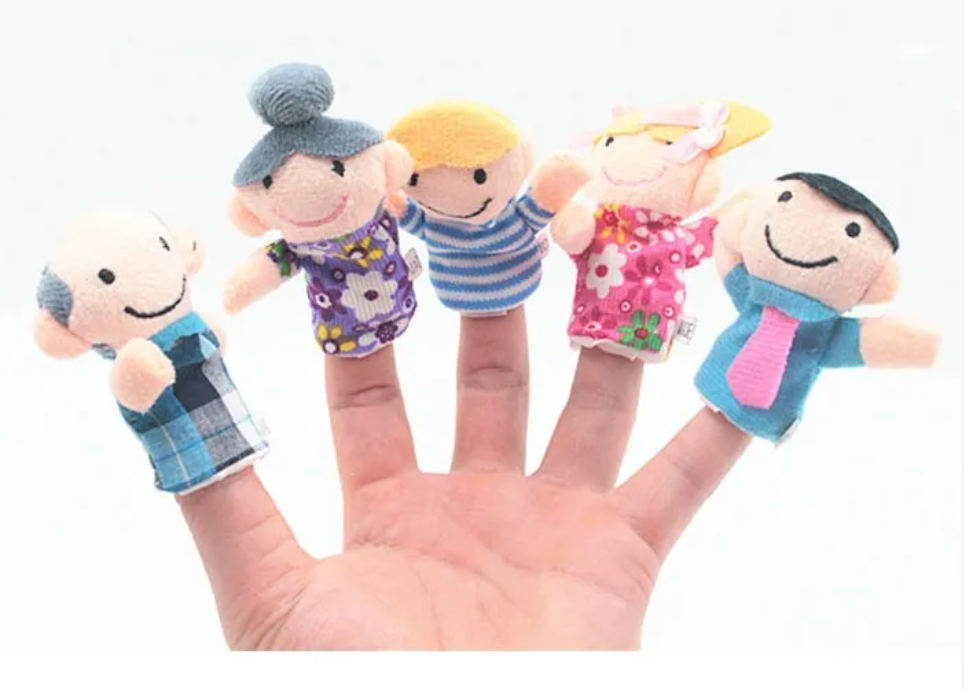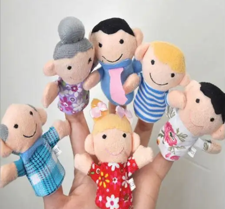 This is a set of 6 Family finger puppets. The puppets are elasticated to help hold them into your fingers.
