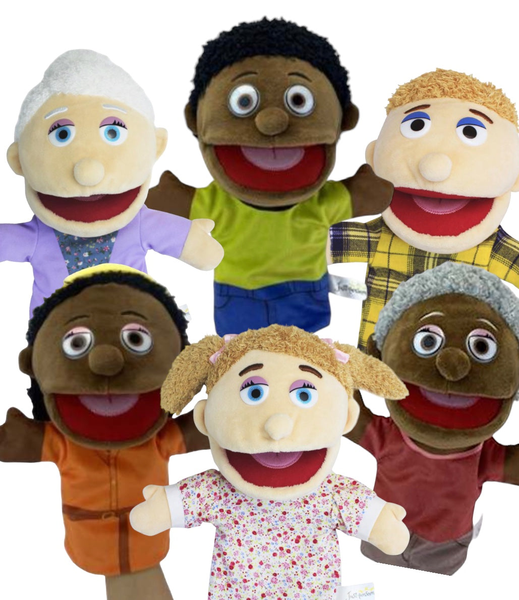 (please be aware that the style of puppets may vary but there are 3 dark skin and 3 light skin puppets in this pack)