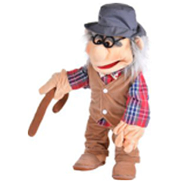 Grandpa is wearing a hat and glasses, brown trousers and waistcoat, checkered shirt and brown shoes. Completely removable clothes. Size 65 cm.