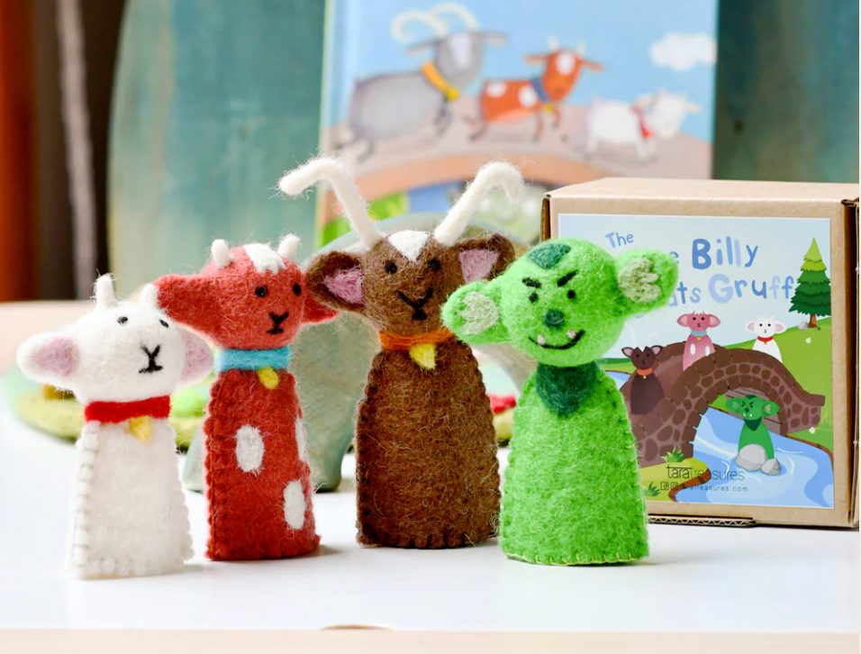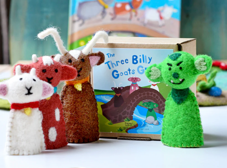 Looking for a fun and adorable set of puppets for your 2-3 year-old? Look no further than this hand crafted 3 Billy Goats Gruff felt Finger Puppet set. This cute puppet set is perfect for little hands and will bring endless hours of entertainment.