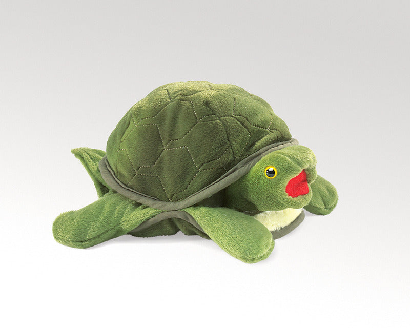 Moveable mouth plush, plump and huggable, this turtle puppet in bright green plush has movable feet and mouth. Grab and pull the front of his shell and he hides inside. Even though he may be shy, he won’t be slow to win your affection. Available in two sizes.